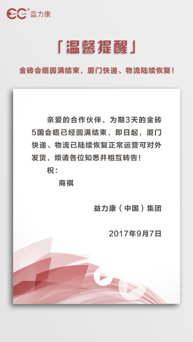 「温馨提醒」金砖会晤圆满结束,厦门快递、物流陆续恢复!分类: 公司资讯益力康2017年9月7日 文章导航上一个上一篇:益力康聚·赢夏季酵素品牌招商会:优势汇聚,共赢未来下一个下一篇:注意!矿物质营养素价格调整啦!相关资讯热烈祝贺全国(区)县域居民健康管理工程服务中心暨健康社区说明会成功举办2025年6月24日董事长宋茂清受邀参加第十二届海峡两岸公共卫生安全与健康研讨会2025年6月24日身芯灵变身——重磅升级,全新PLUS版本来袭!!2025年5月13日惊蛰时节,这5个秘诀助你健康一整春!2025年3月5日号外!益立素优菌80净含量有重大调整!2025年3月5日关于2025年春节放假备货的通知2025年1月8日